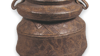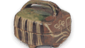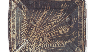 肩の左右に小さな耳をつけた種壺形の水指。白は大きく、口縁を鋭く外に捻り反して平らにし、中に蓋を落としかけるように作られています。室町時代以来の種壺形を踏襲していますので、その姿はいかにも素朴であり、やや厚手に轆轤びきされています。口から胴にかけて、ほぼ全面に緋色が濃くあらわれ、口回りの一部にほのかに白い膚が見えています。胴の下半分には、柔らかく白い地に襷文様があっさりと不規則に巻いています。胴には轆轤目がめぐり、一部にくっつきの跡が黒く横に残っています。さらに石櫨が二か所にあらわれ、底に窯印が刻されています。