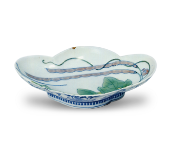 鍋島 青磁 染付 朝顔文 三脚 皿 日本の陶滋鍋島 青磁 染付 朝顔文 三脚 皿 X Facebook はてブ LINE Pinterest コピー 2024.07.18 鍋島 青磁 染付 朝顔文 三脚 皿 高さ5.4cm 口径22.4×22.2cm 高台径13.2cm 三脚 幅広の蛇の目高台の外側三方に脚をつけた三脚の皿で、縁回りを細工して葉形にしている。見込には染付で朝顔文をあらわし、青磁釉をかけている。釉膚は酸化して黄味をおぴている。青磁の焼上りはいささか鈍いが、やはり南川原の青磁染付ものの一つであろう。低く幅広い高台内には鋳釉が薄く塗られている。