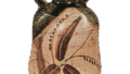 撫角長方の胴に筒形ののついた独特の姿の扁壺。頚頸付根から肩にかけて左右に耳がついています。口部は段をつけ、口縁はやや内にすぼまっています。胴の左右はゆったりとふくらんでいますが、前後は押えて大きくくぼませています。胴裾に鮮麗な赤みがあらわれ、その他は暗褐色に焼き締まっていますが、肩から側而に朽葉色の胡麻釉が薄く降っています。頌の付根の回りには一筋刻線をめぐらし、肩に「○」の印刻・×」の箆彫りをつけ、さらに平らな底裏に「〒」の印を彫りつけています。備前の扁壺のなかでは最も景色の美しいものでしょう。底に籾殻の跡が残っています。