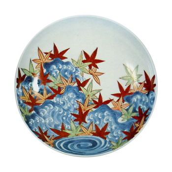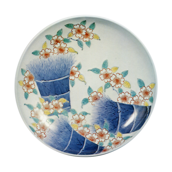 又高さ七寸の樽形の水指に、緑は霙刷毛目を施し胴の雨面に雲刷毛目を文し、そして呉洲にて達筆なる蘭を描き、なほ柄には群青釉を流せしものがあり。又黒栗釉に蓮華刷毛目を施し、或は茶色釉に、呉洲にて蘭花を散文し、又は藤の花や鷺を白にて象嵌せし分銅形切綠六寸の向附皿などは、全く現川風である。其他薄鼠色磁器時代の物には蛇の目積せる粗製の小皿などもある。