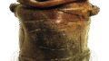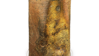口作りは矢筈口風でしょうが、肩がやや張り、肩の左右に耳をつけています。口内は赤く、一方の肩から胴にかけて胡麻釉が降りかかり、他方は赤く焼き締まっています。強い箆彫りが胴の上下に施され、縦にも強く箆目をつけています。底裏中央に窯印が残っています。