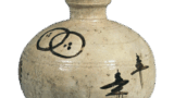 鍋島 色絵 唐花文 向付 日本の陶滋鍋島 色絵 唐花文 向付 2024.08.01 鍋島 色絵 唐花文 向付 高さ6.9cm 口径6.8×6.5cm 高台径4.5cm 端反りにした口辺の三方を花弁にした瀟酒な姿の向付で、三方割の胴には丸文を白抜きにし、中に唐花文を赤と緑で絵付している。赤は艶やかであり、緑も鍋島独特の緑青色で、色絵鍋島の最も美しい色調のものである。内側は白無地。
