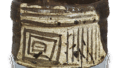 耳はついていなく口は矢筈口で肩をまるく作り、胴は三角に、裾はまたまるく、底は平底でしょう。胴の三方に箆彫りを文様風に賑やかに施し、口部から肩、胴にかけて胡麻釉が薄く降りかかっていますが、釉膚はかせぎみになり、他の面はかたく焼き締まっています。