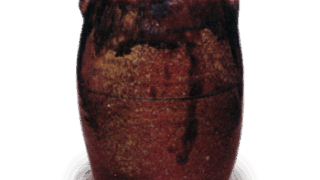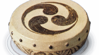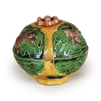 形はやや宝珠形に近く、凛々しく締まっており、総体に黄釉がかかり、蓋甲に白檀塗が施され、その暗朱色の中に鯉一尾と桜の文様が浮き出されている。あたかも鯉の背に桜の花びらが散ったようで、春らしいのどかさがあふれんばかりである。また黄一色の冴えた美しさと、白檀塗との色合いがまことに華やかである。