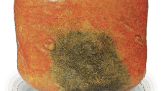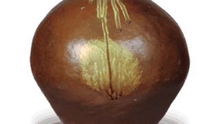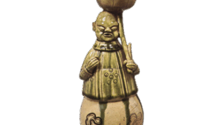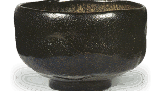 これも伊部手の水指としては初期のものと思われます。他に例を見ない形のもので、口は浅く立ち上がり、肩は強く衝き、裾すぼまりになり、高台が低く削り出されています。肩の左右に輪形の耳がついていますのがおもしろい。口部から肩にかけて胡麻釉が薄く降りかかり、胴の半面にも胡麻が降り、一部はかせ膚になっています。口部に窯屎がついて一つの景色をなしています。「木葉猿」の銘 があり、伊部手の水指では古来著名なものでしょう。