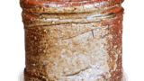 これも伊部手の水指としては古格のある力強い作振りのもので、大きな耳が左右につけられています。口部から胴の一方にかけて厚く胡麻釉が降りかかり、他の面は光沢のある黒褐色の膚に焼き上がっています。胴の二方に草のような文様が箆彫りされ、底に窯印が大きく箆彫りされています。