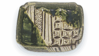 厚手のどっしりとした大振りの沓形茶碗で、見込が深く、畳付の広い低い高台ががっしりとつけられています。胴には檜垣文をめぐらしていますが、美濃のいわゆる織部好風の茶碗と一連共通の作振りでしょう。外側に黄みをおびた胡麻釉が薄く降りかかり、内部は灰色と赤みに窯変しています。このような作振りの茶碗は他に例がなく、極めて稀なものでしょう。広田松繁氏が岡山県の古陶館に寄贈したもので、岡山県の数寄者であった谷口古杏老が、久し振に岡山に帰ったということで「只今」の銘 をつけています。