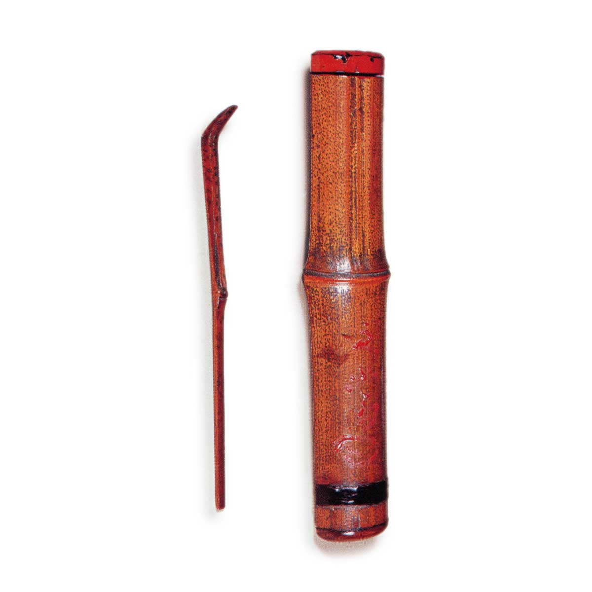 筒は同竹のごま竹で中央に節を置き、底に栓をして漆塗で止めた変わり筒。