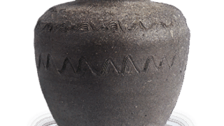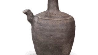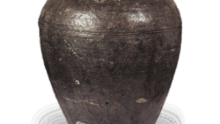 『津田宗及茶湯日記』によると、永禄九年十二月二日に紹鴎の息子武野新五郎が備前物の肩衝を用いたことが記されていますが、やはり室町時代後期から唐物を忠実に倣った姿の茶入が焼かれていたことがうかがわれる。この茶入は永禄年間の作とは思えないが、やはり唐物肩衝茶入を忠実に倣った茶入で、胴から上は窯変に焼き上がり、胡麻釉が降りかかっていますが、胴下半部は緋襷に焼き上がった珍しい茶入でしょう。大振りのどっしりとした姿は古格を示しています。底は板起しで、胴に細く胴紐をめぐらしています。窯印が底に浅く箆彫りされています。
