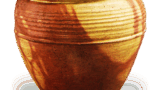 桃山時代の備前茶入のなかでは最も作振りのおもしろい、備前ならではの雅味の深い作でしょう。やや胴長の瓢形に作っていますが、その姿はよく均衡がとれ、胴には四方に縦筋をつけています。窯印を胴にくっきりとあらわしています。胴の一方に灰が降りかかり、他は赤く、あるいは暗く、まことに美しく窯変しています。この種の茶入中の傑作でしょう。黒田家に伝来しましたもの。裾にめぐらした面取箆がきいて、形をよく整えています。