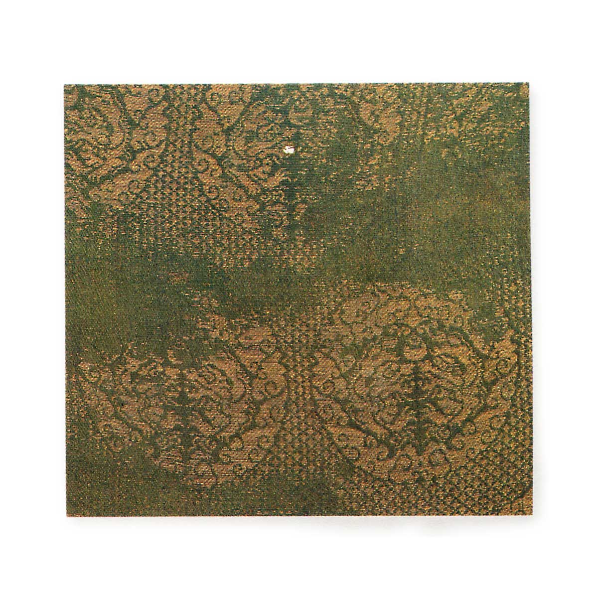 この裂は地合いを金地とし、萌黄の菱紋繋ぎを地織とする。
