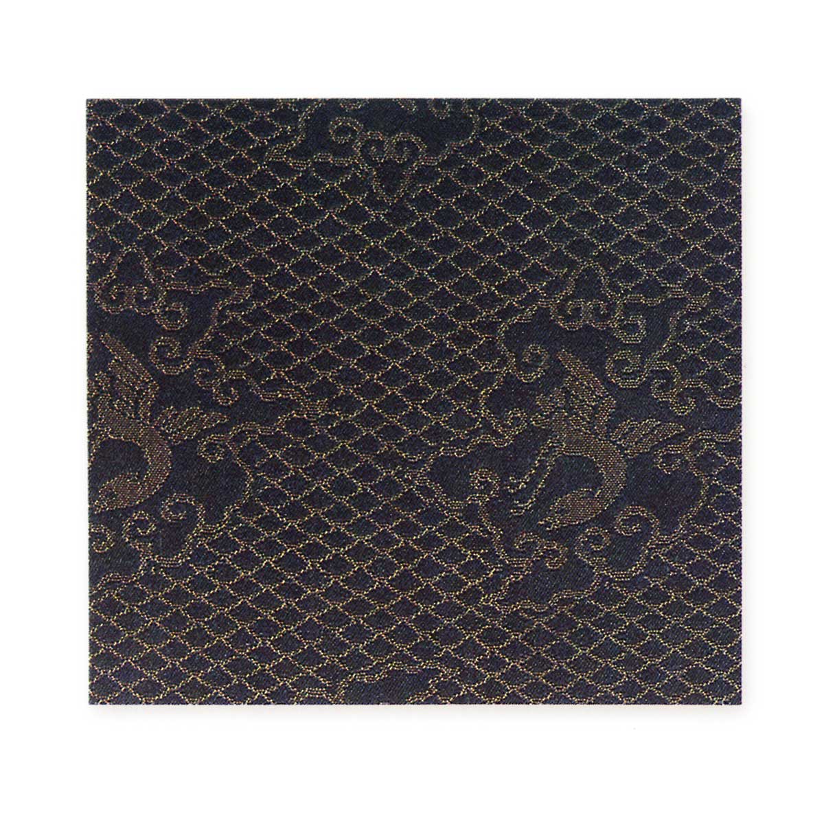網目の地紋に雲枠を散らし、この内に鶴紋を配した雲鶴紋で、地合いは紺地で緯糸に黄茶色を用いて織り出した、明代末期天啓から崇禎頃と思われる意匠形式である。