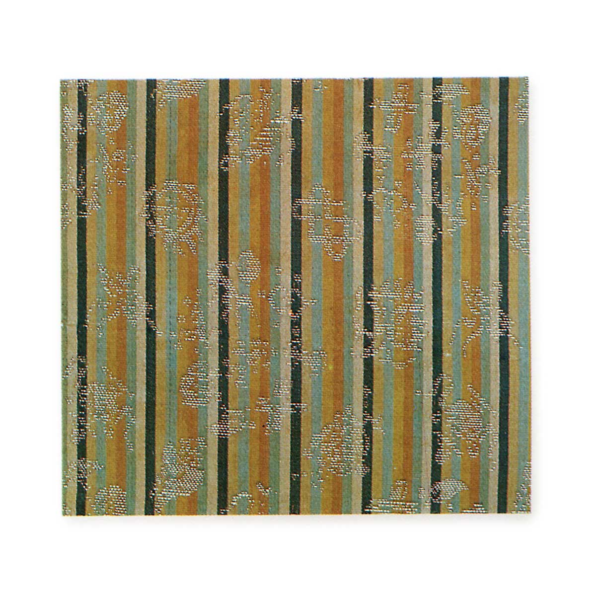 紺・白・浅葱・焦げ茶・茶・浅葱・茶で一組の縦縞を糯子地で織り出し、その上に草花紋と宝尽紋などの吉祥紋を金糸で散らしているが、金糸が半越であるために地合いと融合し縞柄の派手さを押えている。