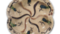 備前 葉形 皿 備前備前 葉形 皿 X Facebook はてブ LINE Pinterest コピー 2014.11.072024.01.24 備前 葉形 皿 Bizen Leaf-shaped dish高さ6.3cm 口径19.0×27.8cm 三脚 大振りの葉形の皿で、備前ではこのような特殊な器形の鉢も作っています。まるい底の三方に先のとがった脚をつけ、見込には葉脈を浮彫りであらわしていますが、たたら作りしたものでしょう。見込に二つまるく暗褐色の抜けがあり、ほぼ全面に灰釉がかかって釉膚ぱかせています。全体に塗土をしています。底の中央に小さい窯印が印刻されています。