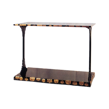 形は四方柱の三段で、中棚の下部に雲形の鰭板がとり付けられ、唐物らしい重厚で格調高い棚である。