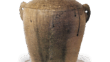 これは器物として作られたものではなく、大きな甕を焼くとき-その甕を匣鉢代わりにして、中に他の作品をいくつも入れて焼成するが、この陶板は甕の上にかぶせて匣鉢蓋としたものでしょう。甕の中の作品にはくっつきを防ぐために藁を巻きつけるが、それが緋襷となる。また、蓋の上にもさまざまの器物を置いて焼いていますので、赤い抜けが生じています。近年この種のものを珍重する人が多い。匝鉢蓋に使われたものでしょうからかなり厚手に成形され、ざんぐりとした姿が味わい深い。この種の陶板のなかでは最も鮮かな景色のものでしょう。裏面に窯印が箆彫りされています。