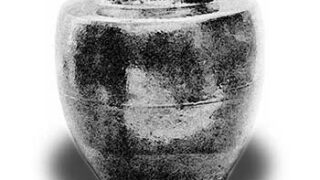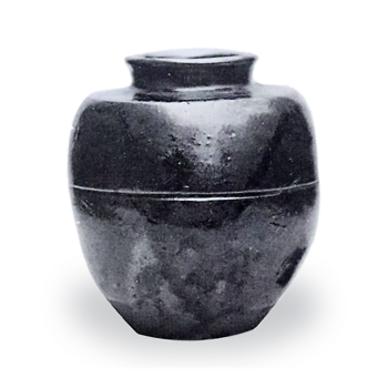 永祿十一九月四日畫、宗三彥右衛門所にて、久我かたつき始て拝見申候なり、形り能く候也、ころ北野などよりすこしちひさく覺え候、藥黑色なり、土てうすに藥かかりたる也、つゆさき一筋あり、底へまはり申候、壺の内へも藥かゝりたるなり、口薄く覚え申候、すこし撫肩なり。 (津田宗及茶湯日記)