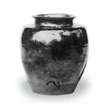 一ハイカツキ天目尼崎臺に薄茶大形茶碗、茶過て金花の大壺、従秀吉宮法へ被遺候郎小天狗の大壺、宮法秀吉様に進上、井棚の三色も秀吉進上也。 (津田宗及茶湯日記)