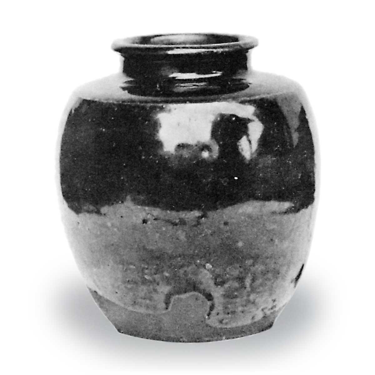 口作粘り返し深く、甑際に一線を撓らし、總體黒飴色釉に薄紫釉斑を成し、光澤鮮麗物を鑑すべし、置形一段濃厚なる黒飴釉、肩先より流れ掛りたるが胴に至りて綜合して一ナダレと成り、裾の邊に至りて止まる。裾以下朱泥色土を見せ、木目の如き小孔二ヶ所あり、板起しにて底廻りギザギザと缺けて不規則なるが頗る雅致あり手磨れなく新に窯を出でたるが如く綺麗なるは漢作茶入中稀に見る所なり。内部口縁釉掛り、以下淺き轆轤続り、底中央の鏡落ち輪状を成すは、最も珍しく見受けらる。