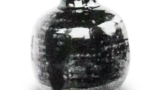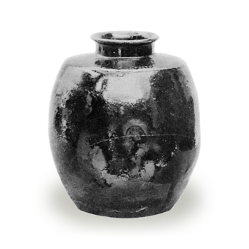 口縁拈り返し深く、甑廻りに二段筋を繞らし、總體黒飴釉紫釉と相交錯し、肩先より黒飴大ナダレ三條連なりたると、別に一筋なだれたるとあり、釉溜厚くして其中に少しく青瑠璃色を含めり、胴中に沈筋一線繞り此邊一帶柿色の點々散在し、手取軽く、口縁より肩にかけて三角形のヒッキあり、裾以下鐵氣色の土を見せ、箆目作行極めて古雅なり、底絲切稍荒く不規則にして起點にギザぎざと筐作あり、又置形と正反面に當りて肩より鍵の手形に長一寸許なる柿色の景色あり、内部口縁釉掛り、以下轆轤繞る。總體館目多く裾の邊高く土を見て 處々景色に富みたる茶入なり。