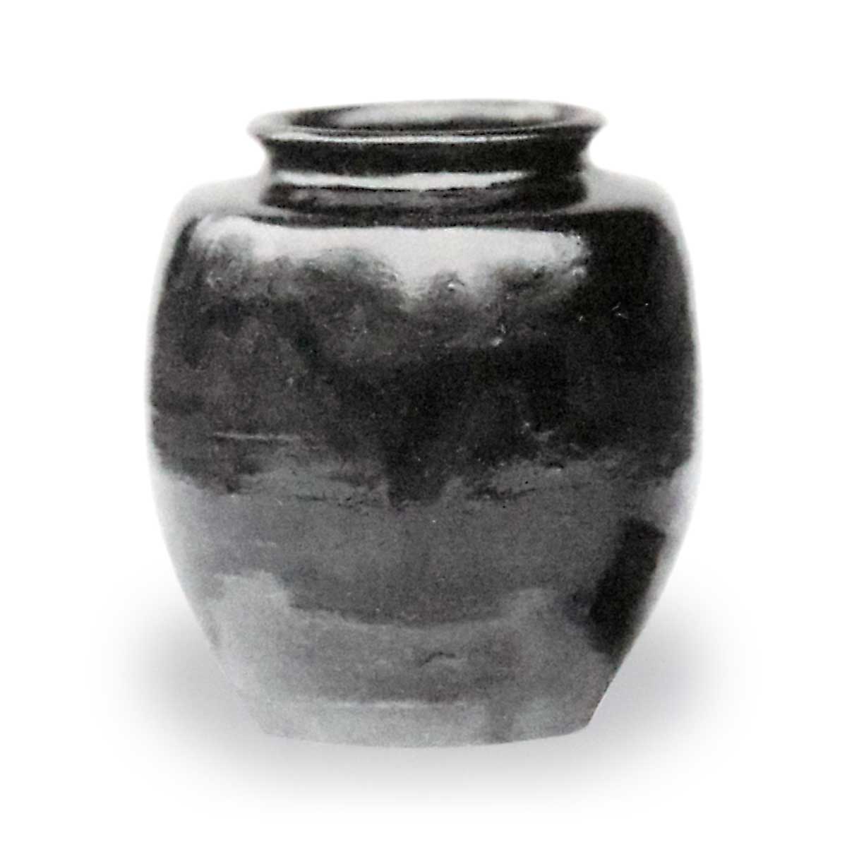 松山 松平右衛門太夫、今町人奈良屋源七、文政十二年三月十一日燒失、口一寸六分、こしき二分半、高二寸七分、底一寸五分半。一體柿黑うるはしく、かなけ多し、胴にろくろ筋かた白くすりとりまき、前にきのヒマあり、肩の作丸き中にかど有。一體作上品鼠土、板おこし、中にふくれ有、底まわり擦れ有之、蓋二、まへより有之、「かたつきのふた」と包紙書付、宗甫公。