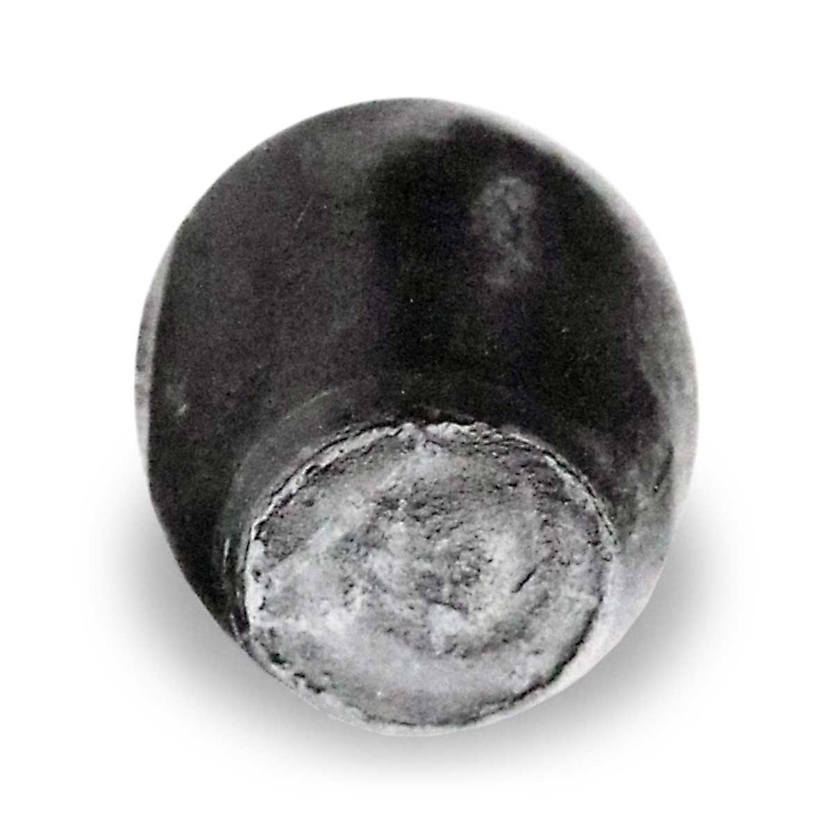 口作粘り返し淺く、下開き其周圏に沈筋一線あり、キッカリと衝きたる肩先に一筋続り、胴少しく張り腰以下次第に窄まる裾のより氣色土を見せ、底は板起しにて、縁廻り少しく高く、内面ギザくと高低あり。總體栗色地に黒飴釉の景色あり、置形肩下より黒飴一線なだれ、裾上際に達す、口縁より底に達する大疵繕ひあり、蓋し火災に遭ひて破損し、釉色も赤爲めに變化せし者の如し。内部口縁釉掛り、以下轆轤目立ち底中央輪形を成して、其中心少しく窪めり、火氣を受けたる爲め、釉カセて光澤を失ひたる所あり。要するに他の景色單純なるが爲め、置形一ナダレ一段目立ちて、面白き茶入なり。
