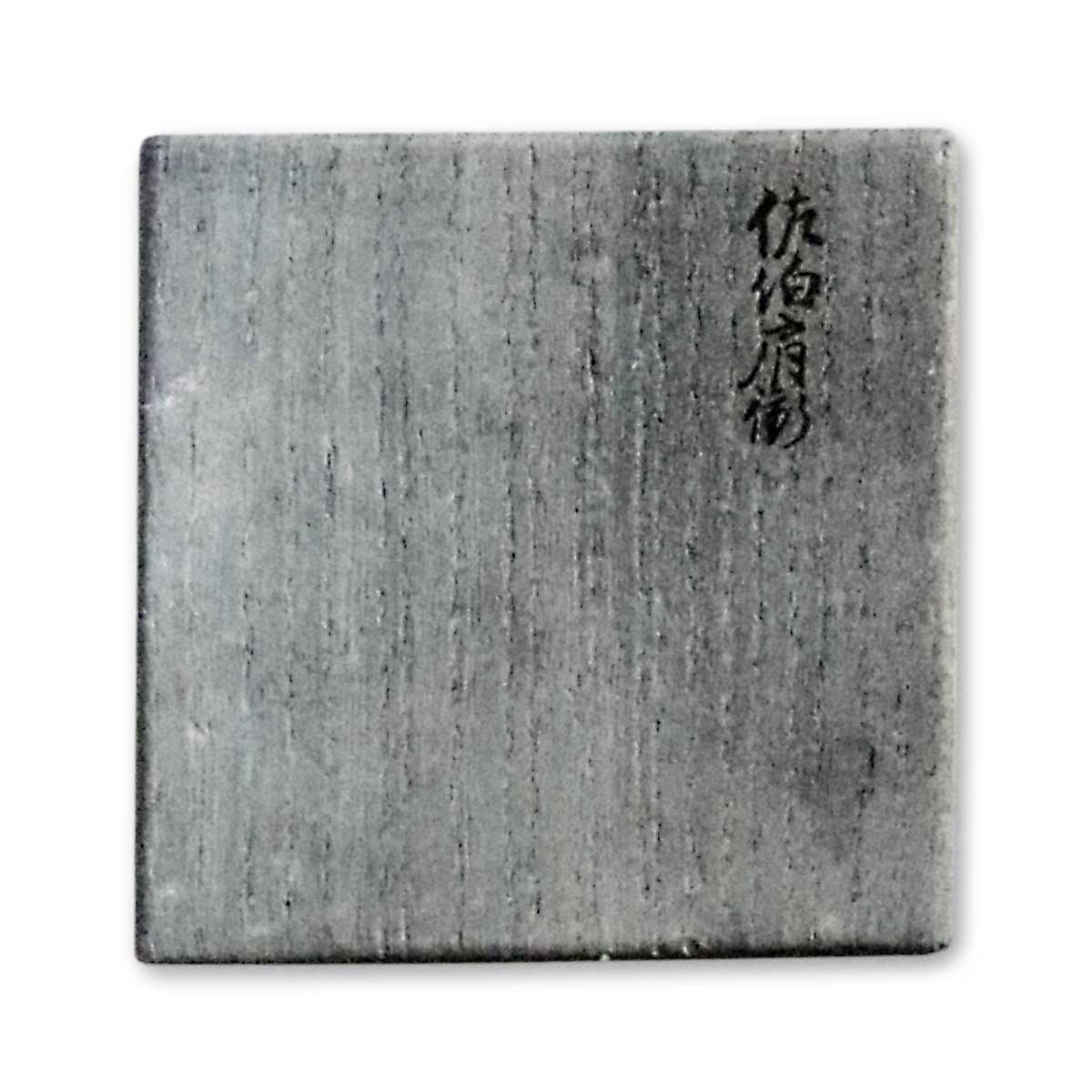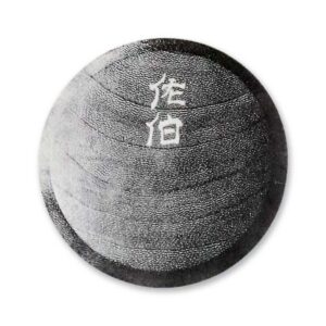 一サイキ肩衝 高さもひきくもなし、形うつくし過ぎたる程にみゆる、藥黒くいかにもかはきたるなだれあり、底つくりかけ也、大さ四ふせ、丹齋の手に少あまる。肩衝盆なし、袋濃いあさぎの純子、又は鳥紋三程あり、水うきぐさ、緒は紫なり。