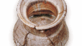 ビードロ釉と焦げ、それに蒼古たる岩石をみるようなくずれが付着し、大きな割れがあります。