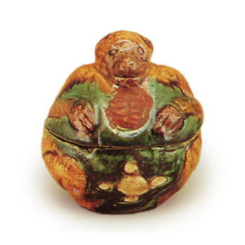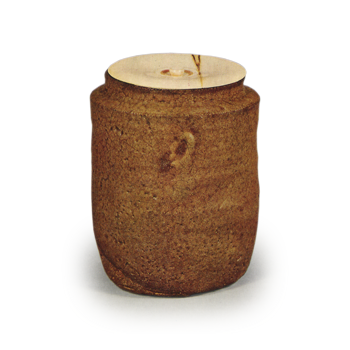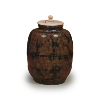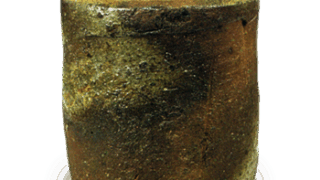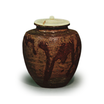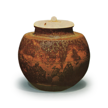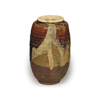 肩面からの立ち上がり正しく、高からず低からず、姿よくおさまったのが、この茶入の特長といえよう。黒みがちの柿釉が総体にかかって、胴筋下に土見があって、濃淡の釉の景色とともにおもしろい眺めである。