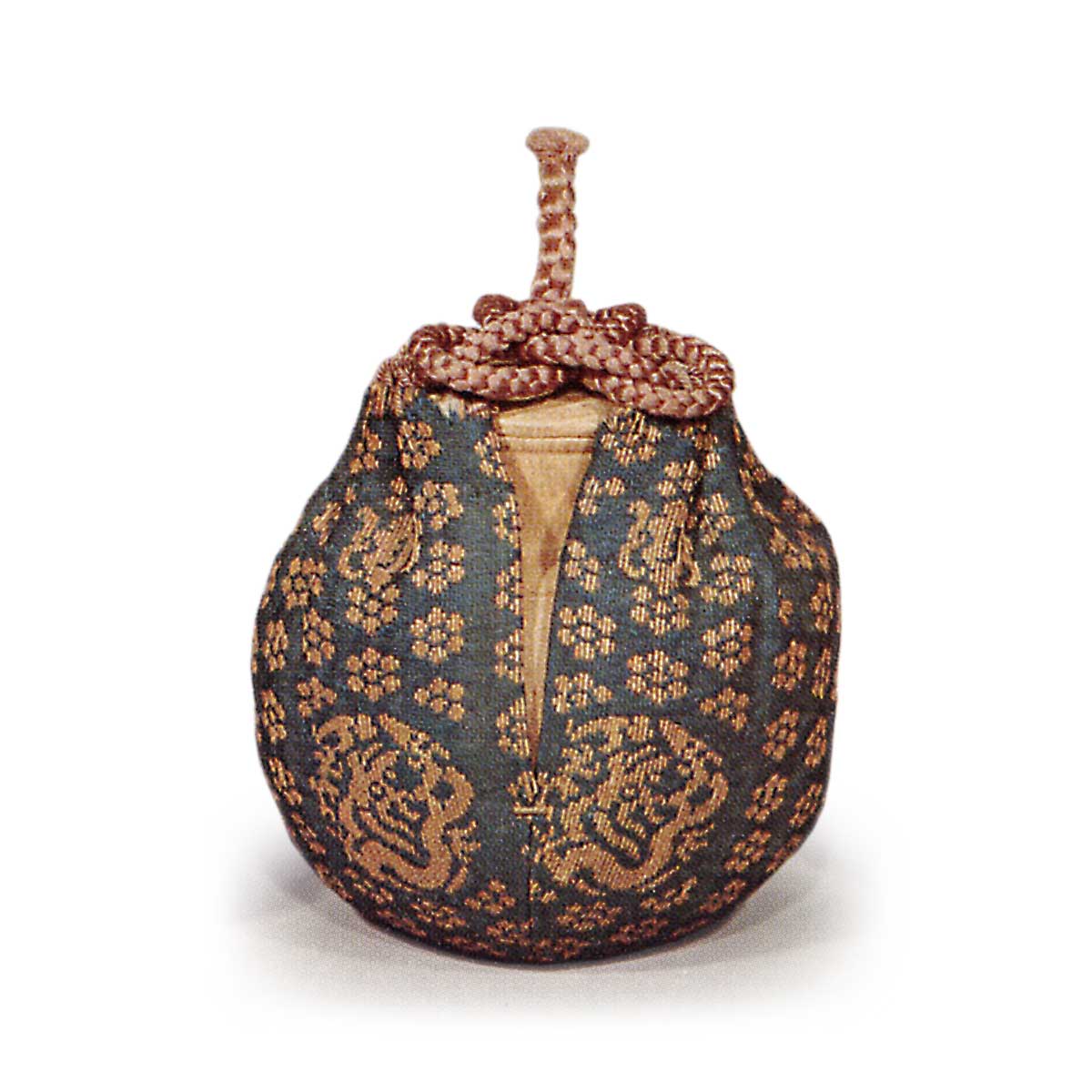 丸壺というのは、唐物茶入の形をとったものであるが、遠州がこれを見出した。真丸き胴より首ながく立ちあがったのが丸壺の特長で、古瀬戸の窯でも珍しい作である。総体に瀬戸釉薄くかかって、濃き黒色が景色となって雲のごとく見えている中ほど首ぎわから、黄釉ほのかにあらわれてなだれかかっているのが、まことによき置き形となっている。裾まわり土見こまかくきれいにしまった糸切りの輪にとどまっているのは、よき作域というべきである。仕覆は四個で、相坂金襴本歌・葛城切のほか二個の取合せおもしろく、いずれも遠州の見立てであろう。