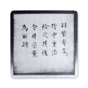 竹中半兵衛重治太閤秀吉より拝領し、今井宗薫加藤風庵稻葉十左衛門相傳へ其後姫路侯酒井家の所藏たり。
