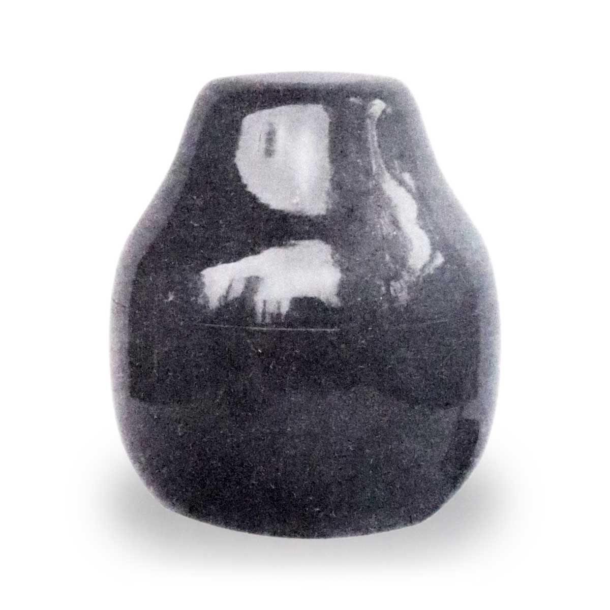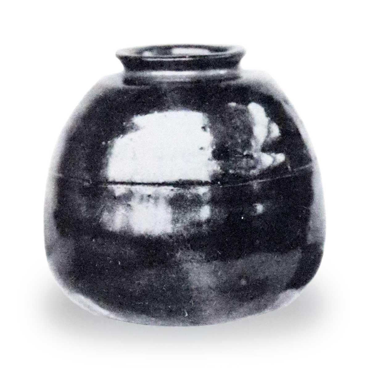 口作括り返し深く肩先より丸味を持ちて腰まで次第に張り、胴に沈筋一線を繞らし、底締り、縁磨り、周圍に朱泥色土を見、絲切細かく、但し約三分通り磨りて起點其他をへり。總體飴色釉光澤麗しき中に、肩先よりムラムラと青味を帯びたる白釉雲の如く漾ひ、裾の邊に至りて稍濃厚となり、面白き景色を成す處、頗る福原茄子に似たる者あり、底廻り土の上に飴色及び青釉飛びあり、胴體にヒッツキ若くはボツボツと膨れあり、轆轤淺く縒り、ブヨブヨとしたる釉質上作言はん方なし、内部口縁釉掛り、以下土の上に轆轤荒く繞り底中央渦狀を成す、茄子としては大形の方にて形狀優雅釉色穠麗にして古來高名なるに背かす。
