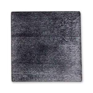 唐物茶入、口作括り返し深く、總體黒飴釉の上に蛇蝎釉、肩下より楔状に流れ掛りて、底土に至りて止まる、胴を繞れる沈筋は一部少しく喰違ふ所あり、底廻りに土を見る事多く絲切至て細かし、平常の茄子よりも頗る大形にして、地釉上釉共稍國司茄子に類せり、内部口縁釉掛り、以下轆轤目繞り、底に至りて渦狀を爲す。總體無疵大形茄子なれば打ち見たる所大々として豊麗なり。
