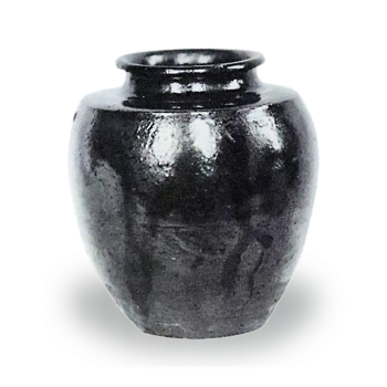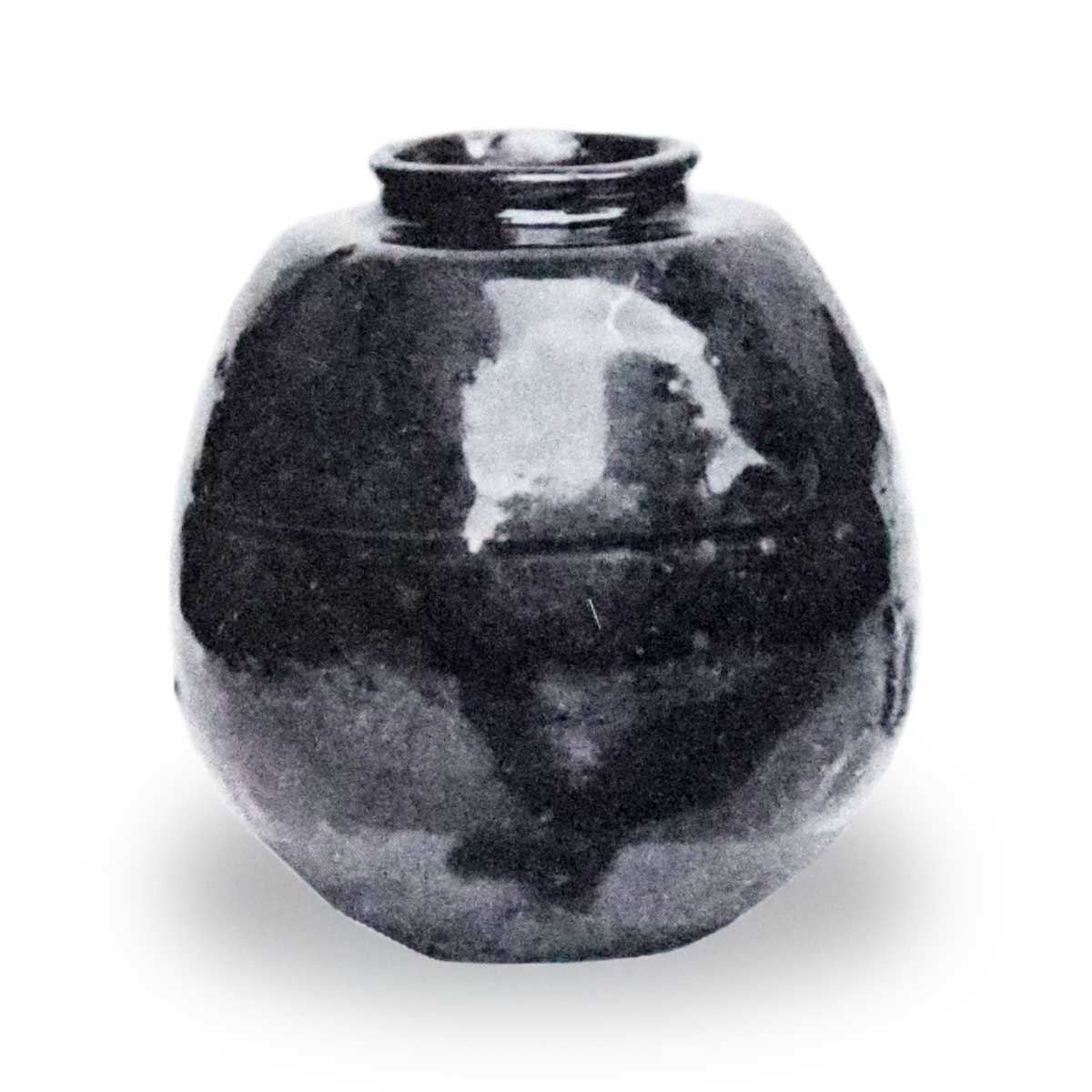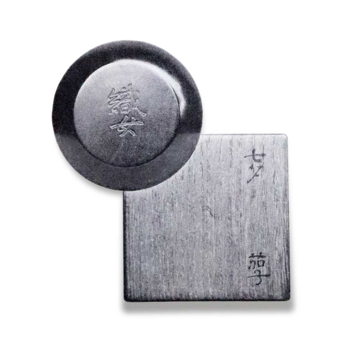 七夕茄子 土鼠藥柿に見ゆる、上藥黒、付糸切逆、盆付内に七夕の二文字と花押あり、傅に筆者相阿彌とあり、置形垂れて底にかいる飛あり、置形左下に二ヶ所不正なるヒッツキあり。 (前田侯爵家道具帳)