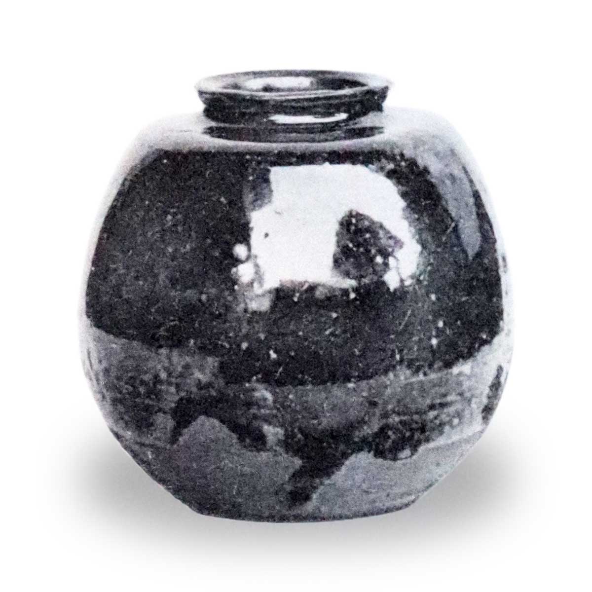 口締り、粘り返し先の如く尖りて精巧なり、薄紫地色に黒飴釉ムラムラと掛り胴に沈筋一線を繞らし、置形釉ナダレ底片隅まで流れ掛る、裾以下白鼠色の土目細き中に、ホンノリと赤味あり、絲切細く不規則なり、又裾以下に柿金氣釉のヌケあり、其名の如く小ぢんまりとしたる茶入なり。