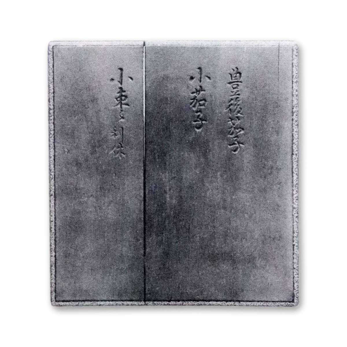 右二個茶入は、利休書判盛阿彌黒小棗と併せて、微妙院利常公御好み、黒柿几帳面唐草模様蒔繪、蓋裏荵蒔繪 平目梨子地箱に入る。是れ此小形茄子二つと小棗一つとを一箱に納め置かんとする公の物數寄なるべし。