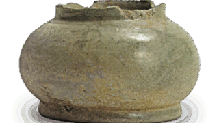 鉄分の多いねっとりした土で、叩きづくり。 内側にかすかに青海波文があります。口は矢筈づくりで、大きな耳が縦につき、底に小さな足が三個ついています。胴一面に筋文様を陰刻しています。全体に黒飴釉をかけ、正面に鉄砂をかけて景色としています。底面に逆L字のローマ字が陽刻文でついています。共蓋は鍵のあるL字が陰刻してあります。甕屋の谷、焼山両窯からL字のいろいろな銘入の作品が出土します。