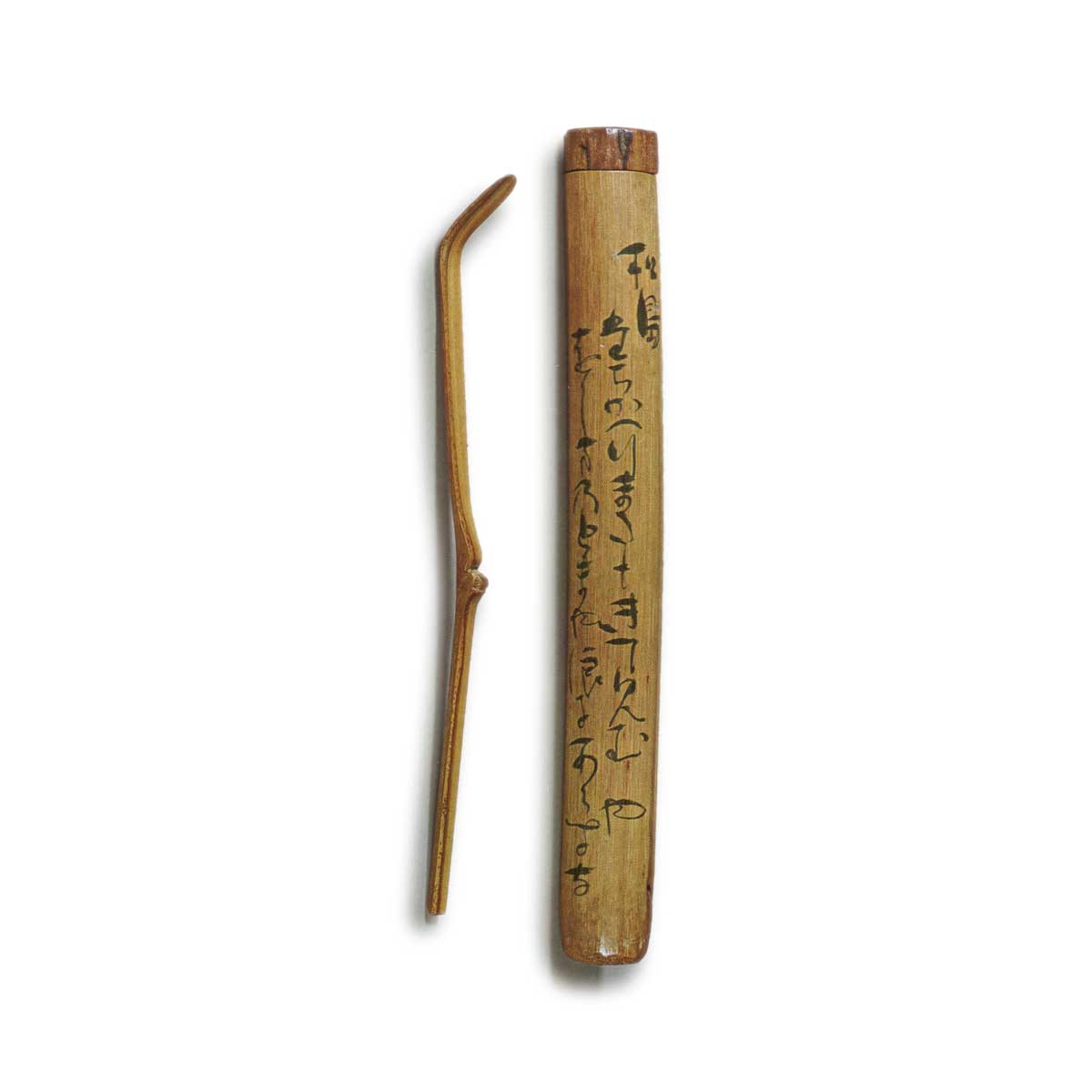 竹も「乱曲」と同じに、扁平で、しかも一種の曲り竹を利用して、遠州が器用に見事に書入れしている。つめは縞柿であり、遠州もかなり念入りにつくっている。