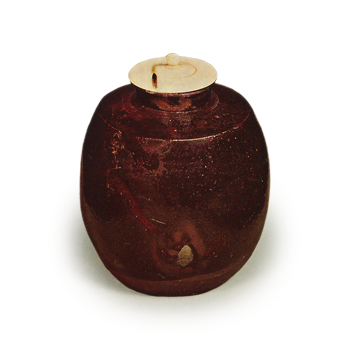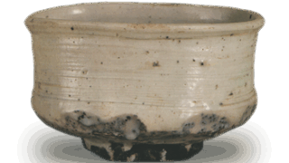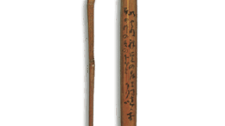 宗旦のなかでも稀に見る見事な筒である。総削りの真筒でありながら、筒正面を薄く面取して、しかも黒みがちな変り斑が苔のようににじみ出て、あたかも瀑布の水が巌にくだけて落ちるような景観である。稚拙な宗旦の文字はたどたどしく表面に書かれ、側面は玉舟筆である。
