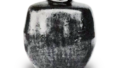 珠光琳 南部大膳太夫 高二寸三分、口八分胴二寸三分餘、盆附九分地柿置形黒肩の所に少し蛇蝎あり尤黒形置形の中より吹 候なり、帯太く、口返し誠に尋常内渦(個)、如此引上るなり。挽家銕刀木蓋裏梨子地甲斗粉留メ朱にて珠光文林と有り、袋萠黄上挽家いす面取、甲に朱にて漢とあり、袋縫海氣茶花裏紺博多嶋。内箱黑塗萠黄島眞田。上箱溜塗錠前付袋六ッ、利休好萌黄純子、三齋好有樂純子、紹鷗好萠黄地金襴、珠光好古金襴大やつれ、織部好廣東、舟越豫州好紹鷗純子、蓋八枚。添盆存星四方盆龍模様。添文珠光請取文懸物(文言略す前記の通り)古筆了仲極添ふ桑山修理一玄文。(茶入圖あり) (箒庵文庫甲第七號)