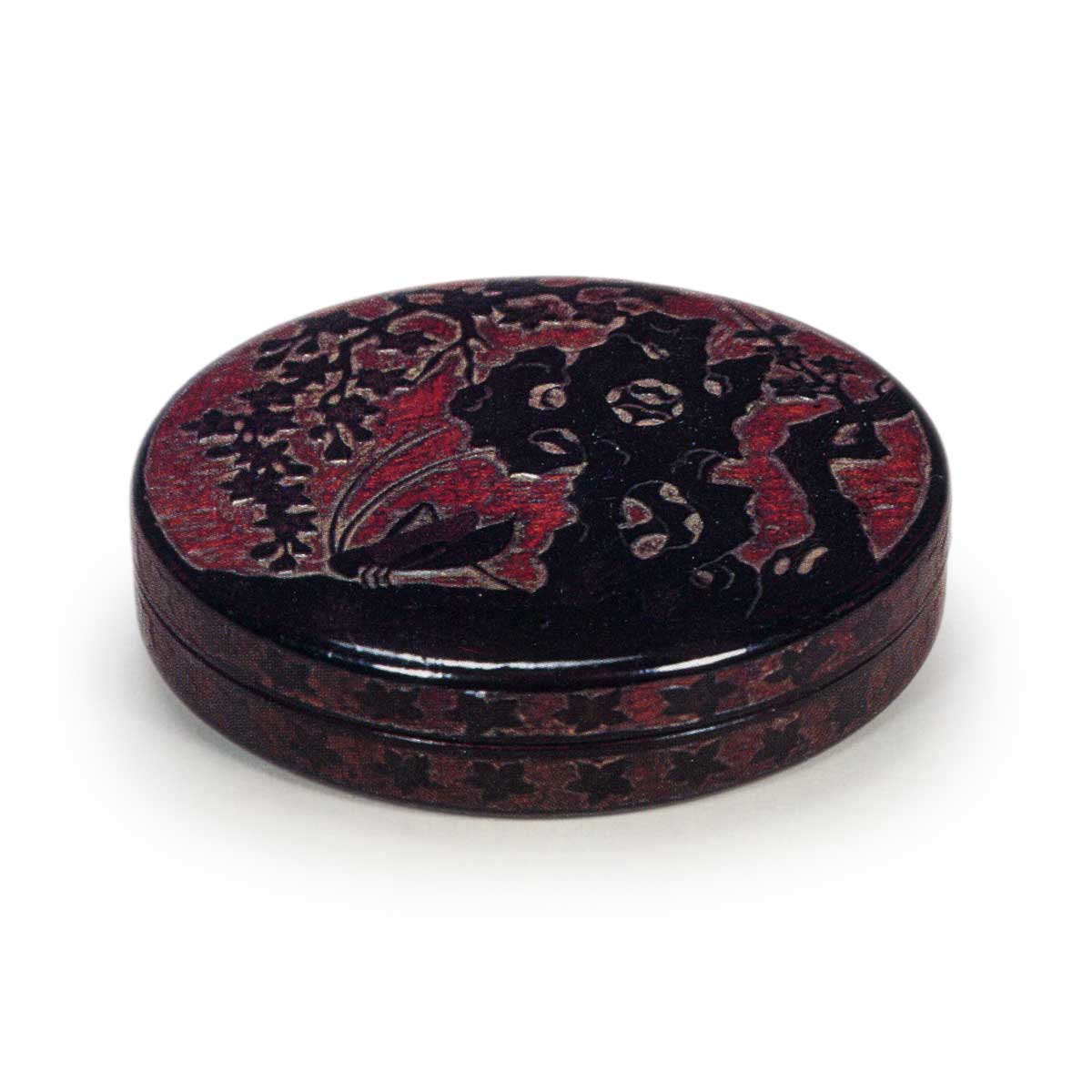 この香合は、色彩は比較的単調のようであるが、絵文様はいたって精密で、太古石にそって繁る樹木の下にすだく虫をそえ、総体の暗色をきかせた画面構成の手法がまことに面白い。