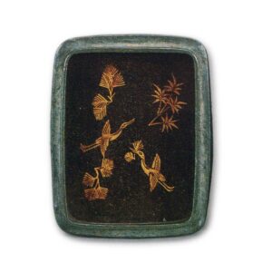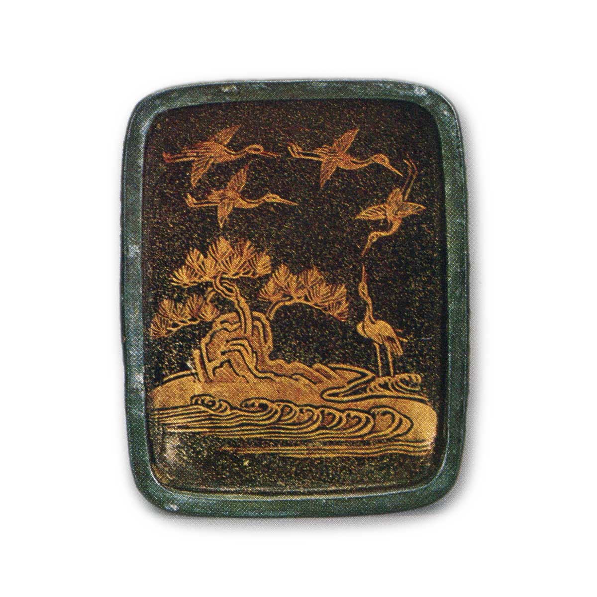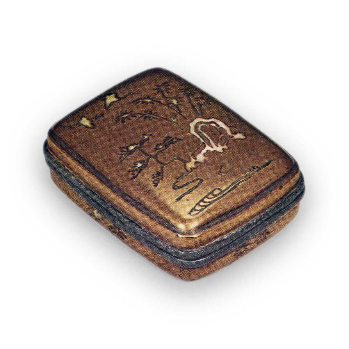 この香合は、長角、錫縁で、総粉溜に蓬萊山の図を、螺鈿とともに蓋の表にあらわし、蓋の裏にも同じく蓬萊山を蒔絵し、身のうちは、松喰鶴を蒔絵して、錫縁も完全に保存され、合口もよい。
