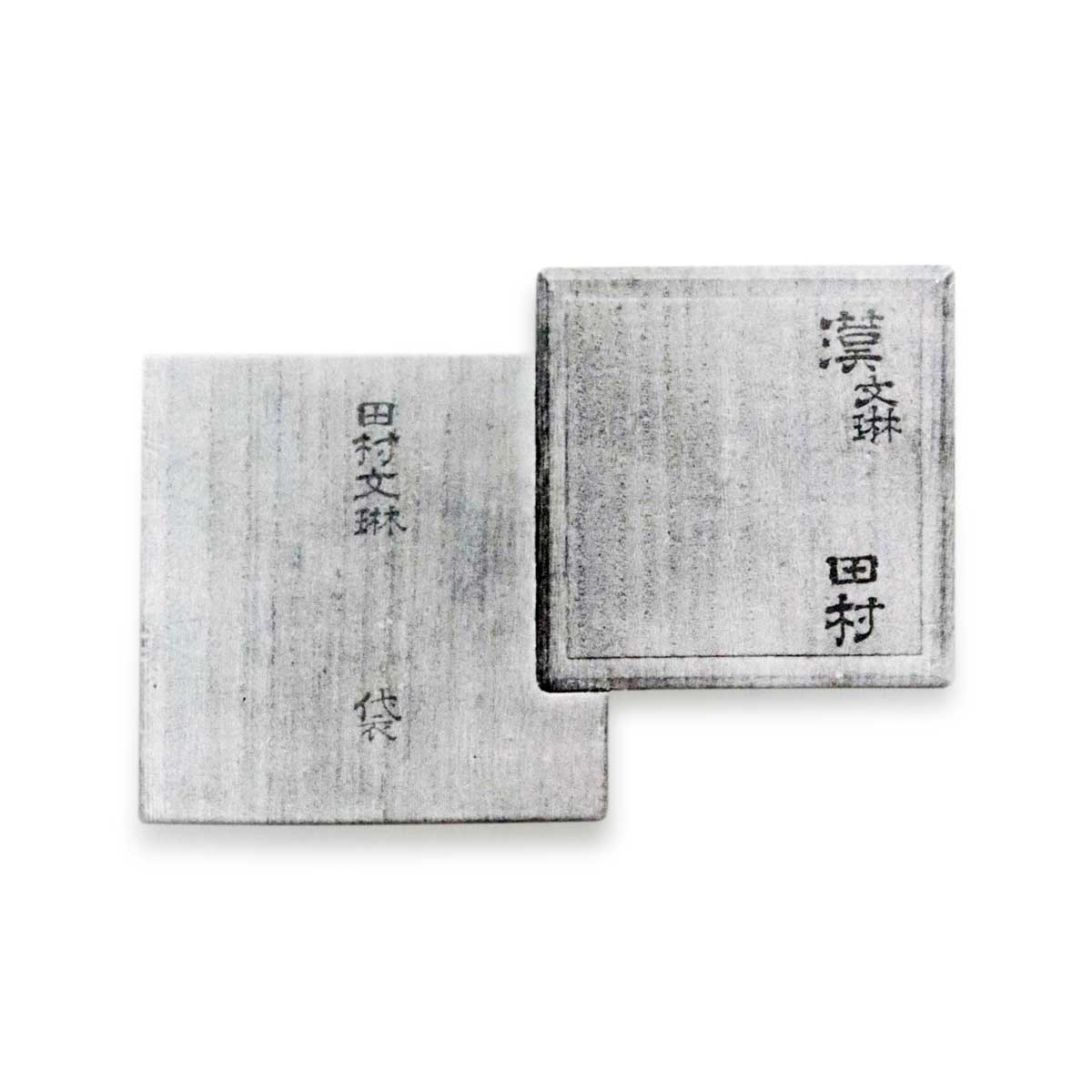 田村文琳 河村傳衛氏所持。 袋天下一田村文琳袋明治二十五年三月四日五衛河村傳衛殿道具の内、三月十日調査の分、三冊名物、土屋臓帳の内、明治二十五年五月廿九日より六月一日まで星ヶ岡茶寮に於て、川村傳衛氏藏品入札あり、三井銀行引請、茶入記事詠物類衆にあり、明治二十九年五月二十七日、馬越様拜見物。 (松山靑柯著つれづれの友)