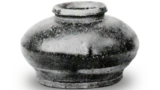 口作拈り返し淺く、其繰に一ヶ所凹處あり、飯下張り肩撫で胴張り裾窄まり底大に締れり。總體飴色釉と黃釉と交錯して、一部は鶉斑を成し、飯廻りより肩全面に掛けて黃釉一面に掛り、他の部に於ては肩先より盆附まで飴色釉の間に黄釉チラーざ現はれて面白き景色を成し、又黃釉中に飴釉ヌヶたる所あり置形黃釉肩先より裾に至るまで一筋なだれ釉溜り稍厚く胴體轆轤目薄く繞る、盆附廻り僅に銕氣色の土を見せ、底半面を蔽ひて釉飛びあり、又一部に土缺け落ちあり、爲めに糸切鮮明を缺けざも、又爲めに大に風情を增せり、内部口緣飴釉廻り以下轆轤目細かく底中央に至りて細き渦狀を成す總體景色極めて多く斯くまで光澤麗はしき文琳は他に其比類なかるべし、形狀も亦飽まで上品にして、全部無疵。一個の名璧ごも見るべき茶入なり。