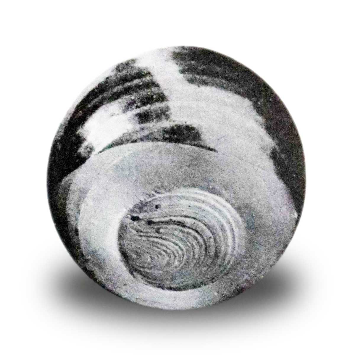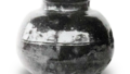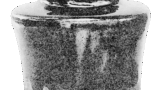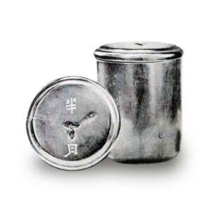 半月唐物文琳茶入 高壹寸九分胴壹寸九分、口七分底九分五厘。袋純子花色丸紋龍の丸 裏絹唐物 緒つがり紫。挽家桑虫喰有、繕も有書付金粉,袋丹地純子裏タマムシ緒つがり茶。外箱桐口紫檀のつきあり、挽家箱書付共一遠州公筆、裝束同人好。|半月 文琳(半月) (古今名物類聚)
