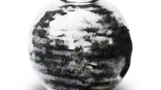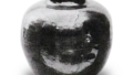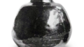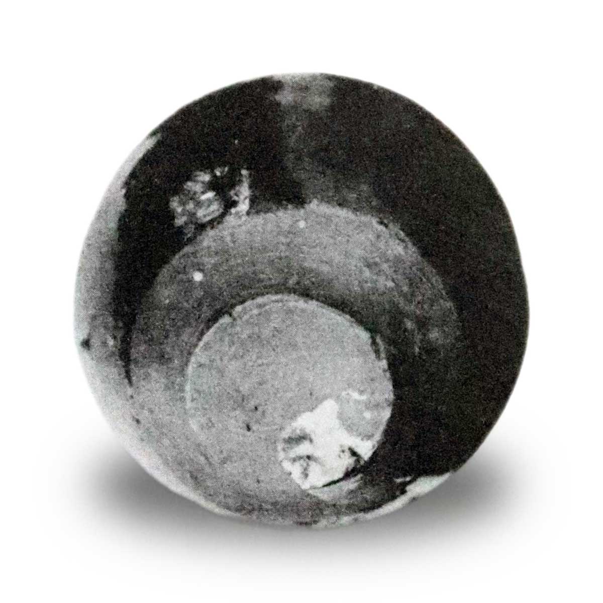 口作玉繰にて飯廻り稍窪み、肩丸く張り、胴に沈筋一線を繞らし、同線以下盆附まで次第に窄まる、口緣に茶入三分の一に亘る大疵繕ひあり。總體黑飴釉の中に梨皮色一面に現はれ、又肩先及び胴筋附近に於て釉ヌヶあり、置形共色釉裾土中に流れ掛りて止まる、腰廻りに小さきハゼ一ヶ所あう、裾以下朱泥色の土を見せ、ヒッッキ二ヶ所あり、糸切細くして不整ひなる其片隅に釉飛びあり、内部口緣釉掛り、以下轆轤繞り、底中央渦狀を成す、釉質頗る天目釉に似たる所あり、手取輕く形狀釉色共に文琳中一種の變作と謂ふべし。