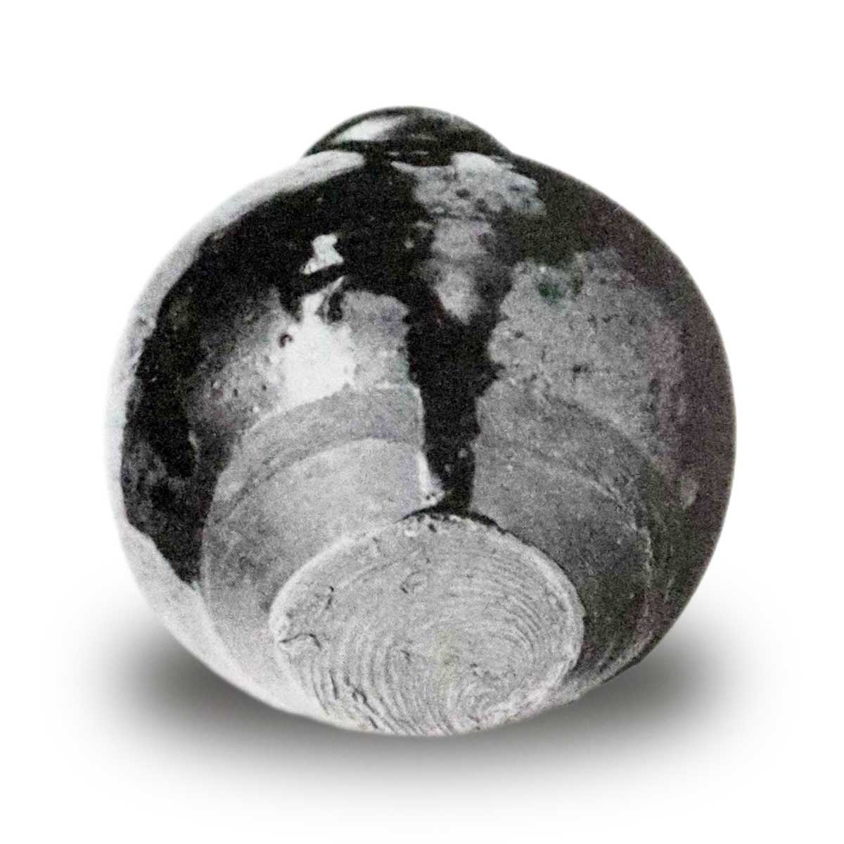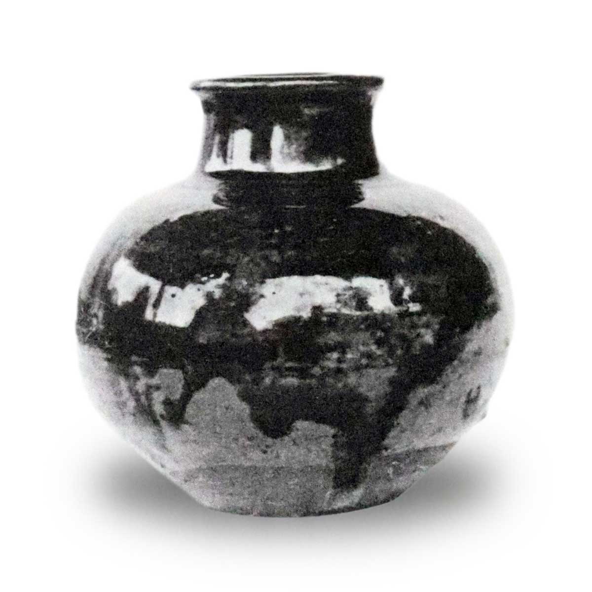 唐物丸壺にして、紫色互えくしく、黑釉光澤物を鑑すべく、一面の景色判然として其綺麗さ言はん方なく、全部一點の疵を見ず、飯際に黑沈筋一本を繞らし、置形模樣幅廣けれども、裾近くに至りて細き一筋ナダレとなり、露先盆付に至りて止まる、黑釉八重襷の如く掛りて、景色麗しく、胴に茶入半分强の黑筋を繞らし、裾以下朱泥色土を見せて、土際に一點小高き煎餅膨れあら、又鮮明なる糸切内に小さきヒッッキ數々あり、ロ作拈り返し淺き方にて、形狀の優美釉色の鮮麗言語に絶し、其完全無缺に至うては唐物丸壺中稀に見る所なり。