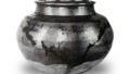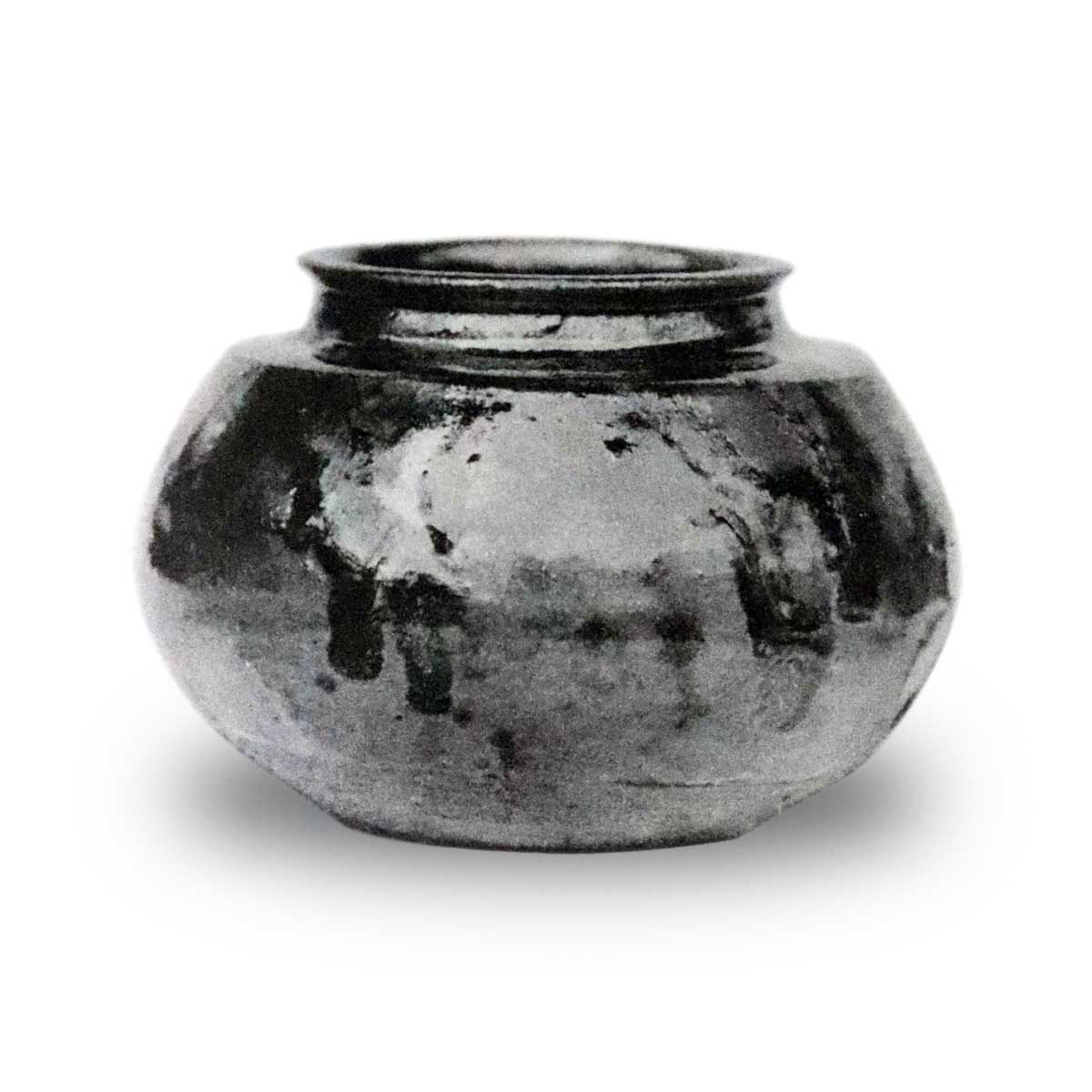 八島大海 藤田傳三郎殿藏品の内、中興名物唐物。黑黄藥交り、春慶出來、本糸切。高サ二寸二分口一寸七分四厘底一寸四分八厘胴二寸九分。袋五ツ、遠州純子、茶地雲珠純子、法隆寺漢東、角倉清水切。箱書付甫公添盆唐物朱四方、斑竹緣、袋紅ランケン純子、箱書付宗慶殿、外題了仲。 (松山青柯著つれ々の友)