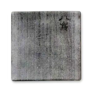 八島 夏山手 高二寸二厘胴二寸九分一厘、口一寸七分五厘底一寸五分弱。蓋一枚窼、一文字の蓋めん。袋茶地雲紋純子 裏かべちょろ 緒つがり茶。箱桐蓋「八嶌」遠江守筆。黄藥なだれ、糸切かすか(茶入圖あり) (名物記附錄)