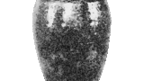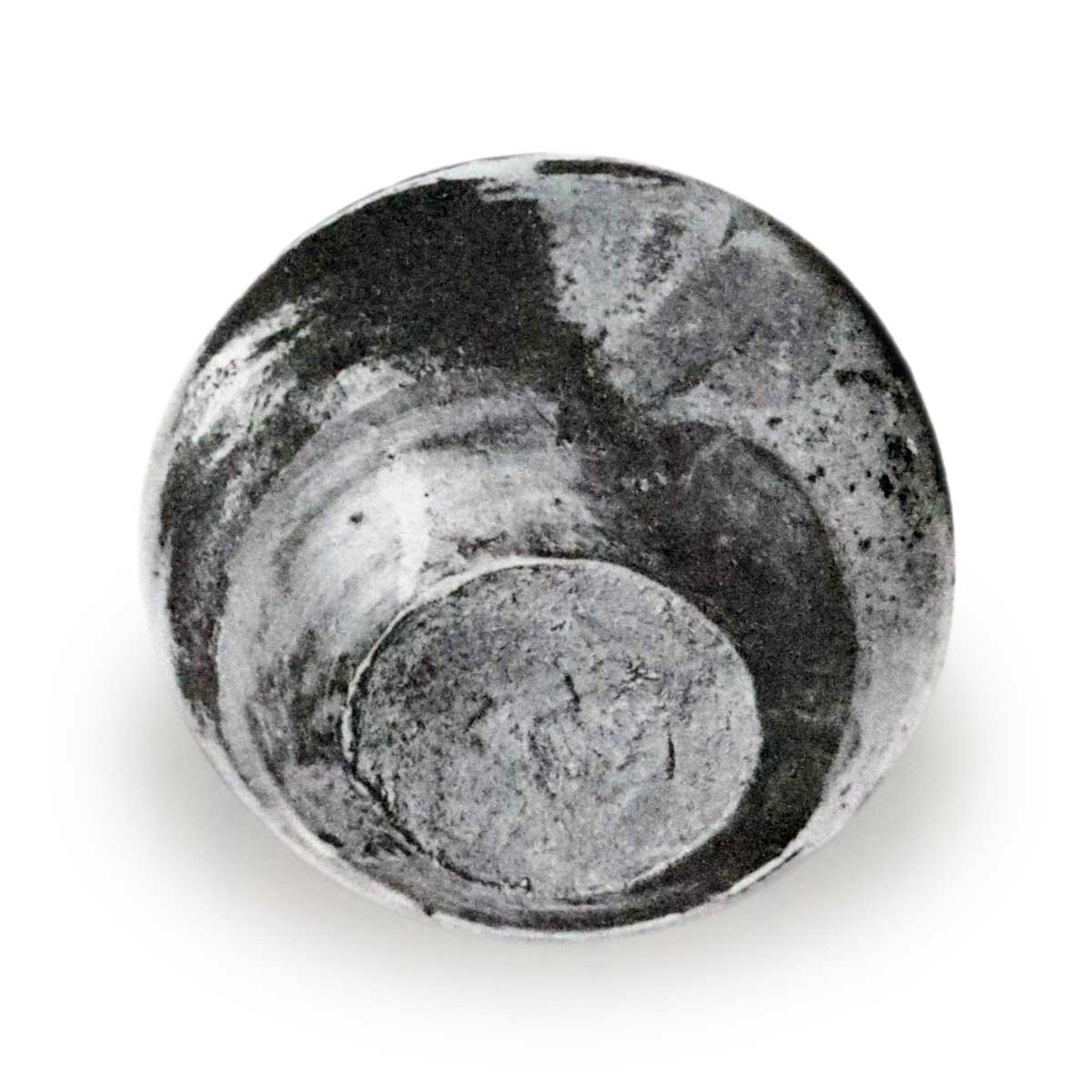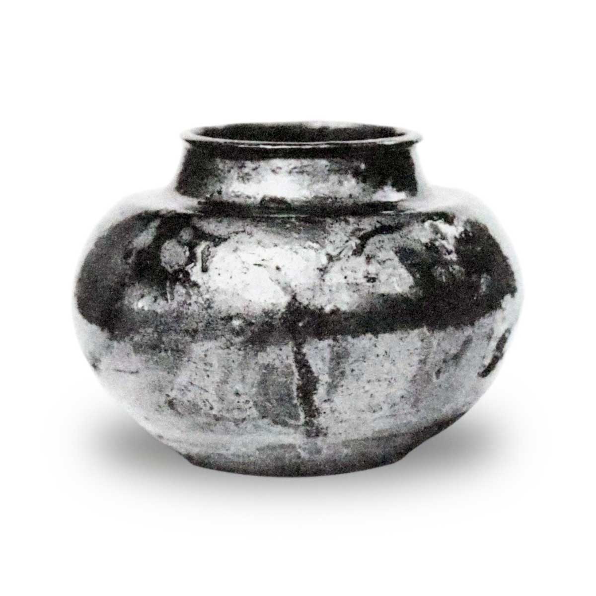 口緣粘り返し厚薄不同、飯下張り、其周圍に沈筋一線あり、肩先より胴まで次第に張り、胴以下盆附まで次第に窄まる、黑金氣色の上に柿金氣釉相錯綜して、景色變化頗る多し。肩先より胴廻りにかけて、ヒッツキ數ヶ所見ゆ、腰以下轆轤目淺く繞り、底朱泥色の土にて、板起しなり、時代古く、手取輕く釉質上手にして正しく漢作なるが如し。黑飴釉肩先より一線流れて、盆附際に達する所あり土中ホッレ若くはヒッッキ多く、總體景色に富みたる茶入なり。内部口緣釉掛り、以下轤轆目荒く繞り底中央渦狀を成し、此邊一面に水釉掛り、黑釉飛び一點あら。無疵にして唐大海中有數の出來物と見えたり。